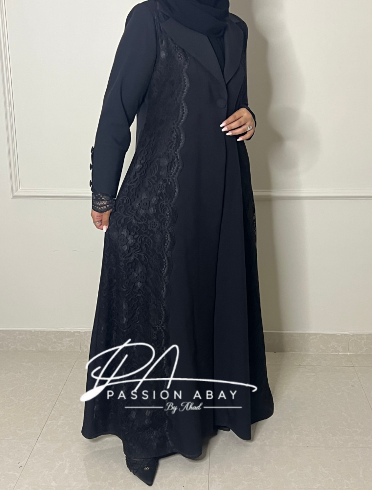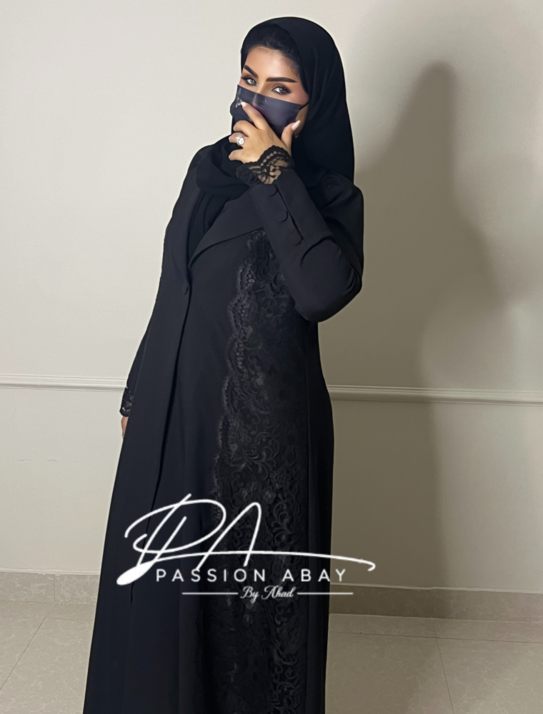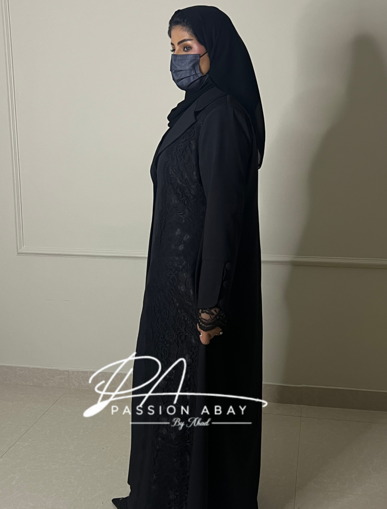 العباية مصنوعة من كريب واقف مع دانتيل، مما يمنحها مظهرًا أنيقًا ومريحًا في نفس الوقت.
