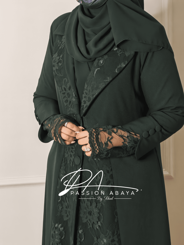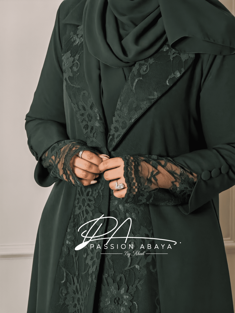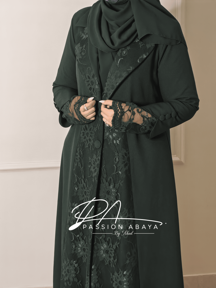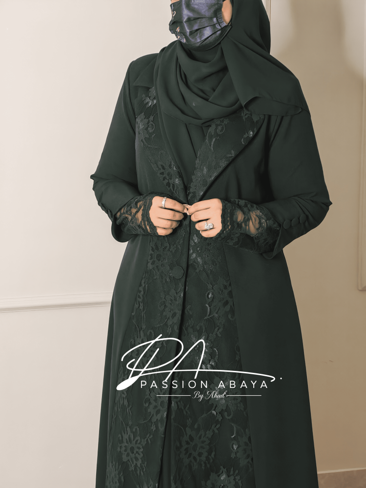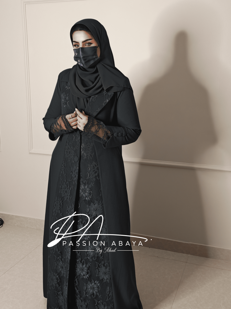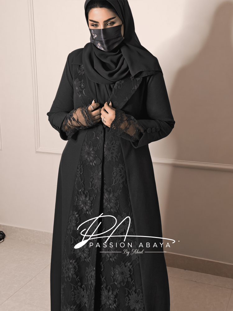 عباية كريب اسود من Passion Abaya By Ahad هي تصميم فاخر مصنوعة من كريب واقف مع دانتيل، وتتميز بقصة موديل A مع كلوش من الأسفل، مما يمنحكِ إطلالة أنثوية وعصرية في كل مرة ترتدينها.